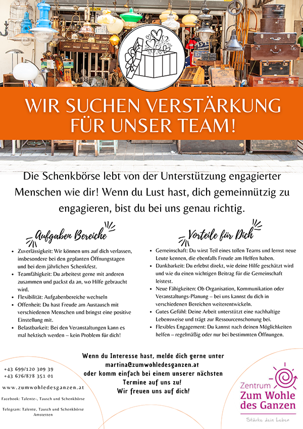 Die Talente-, Tausch- und Schenkbörse Amstetten ist eine gemeinnützige Initiative und besteht aus einer kleinen Gruppe von Menschen, die es sich zur Aufgabe gemacht haben, den Gedanken der Schenkökonomie in die Köpfe und Herzen der Menschen zu bringen.